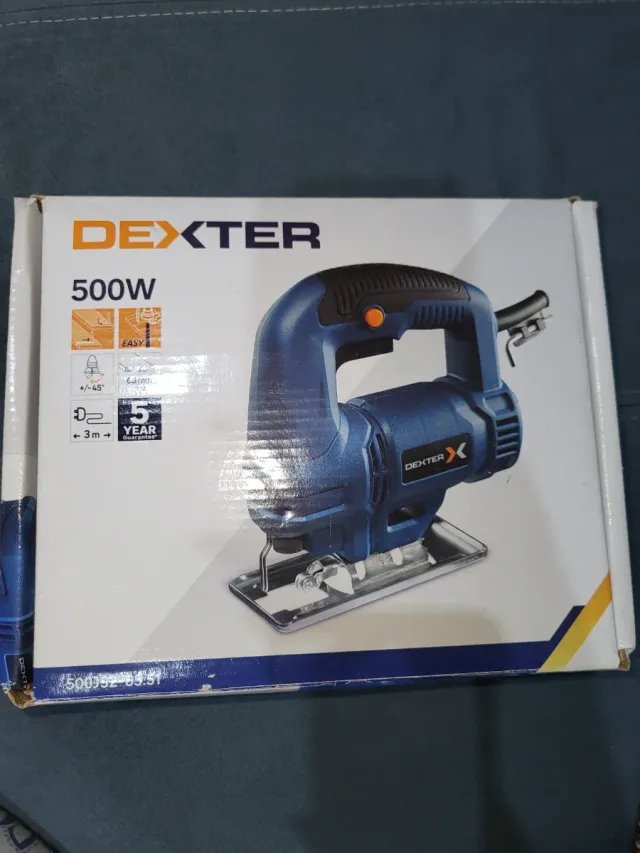 Sierra de calar eléctrica de color azul. - Mango ergonómico para un mejor agarre. - Botón de encendido naranja.