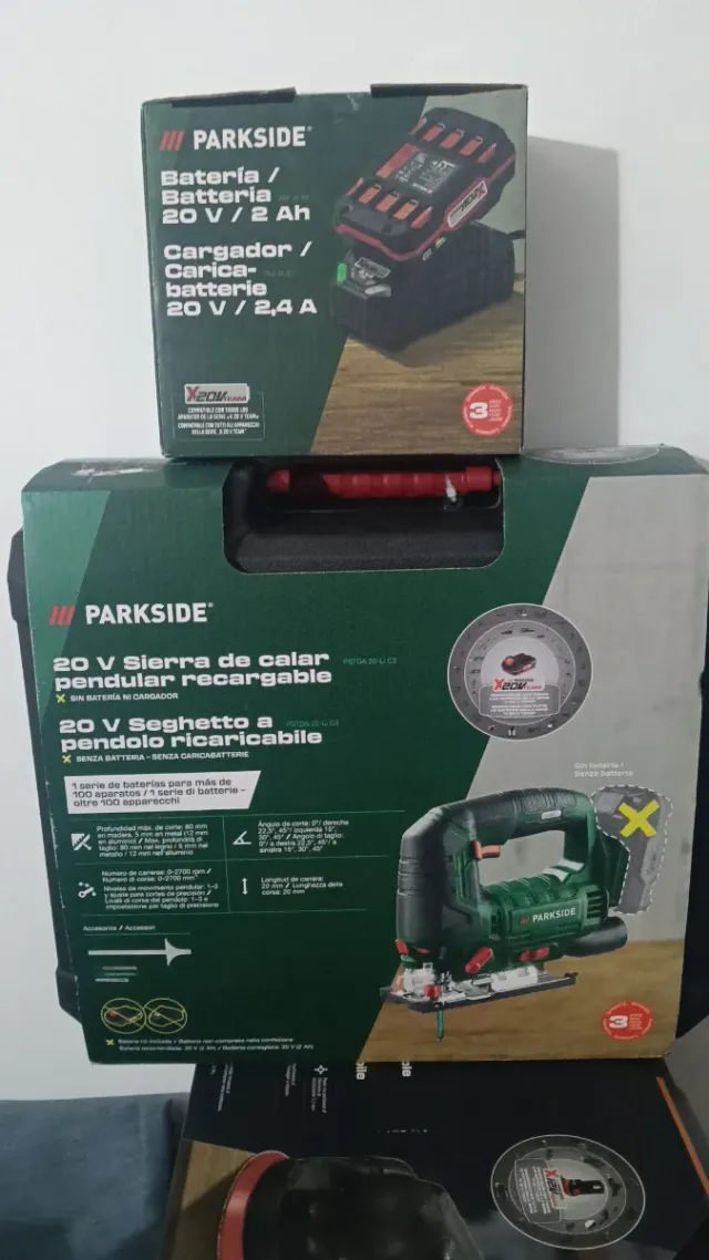 Detalles del productoSierra de calar pendular recargable de la marca Parkside, modelo 20V con batería y cargador.