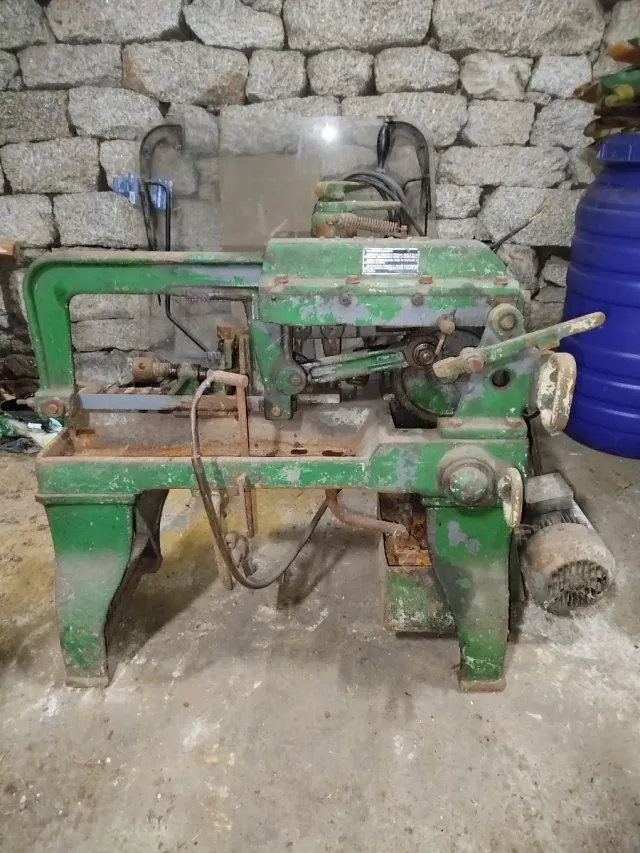 Sierra de cinta vaivén de color verde, con motor y despoilsito de taladrina