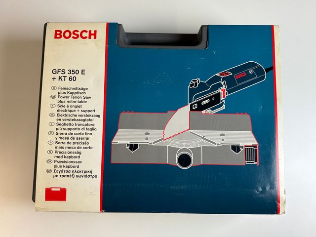 Sierra de corte fino BOSCH GFS 350 E con mesa de aserrar KT 60. - Sierra de corte fino. - Mesa de aserrar.
