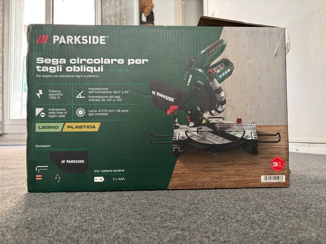 Detalles del productoSierra de inglete Parkside PKS 1500 C4, ideal para cortes precisos en madera y plástico. Sin usar.