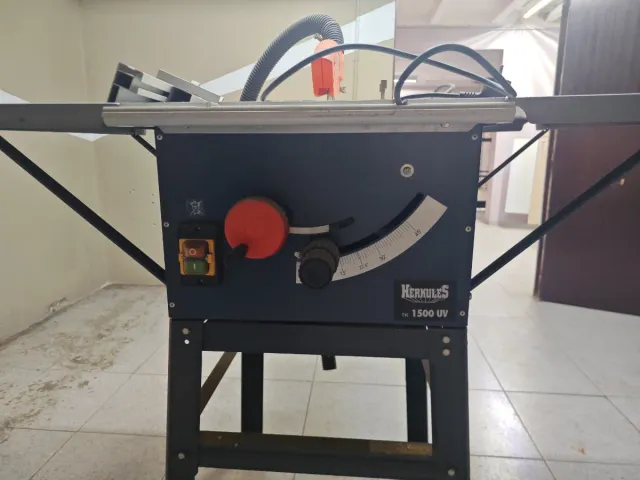 Sierra de mesa para trabajos de carpintería. Su diseño es robusto y funcional. - Estructura de metal. - Superficie de trabajo amplia.