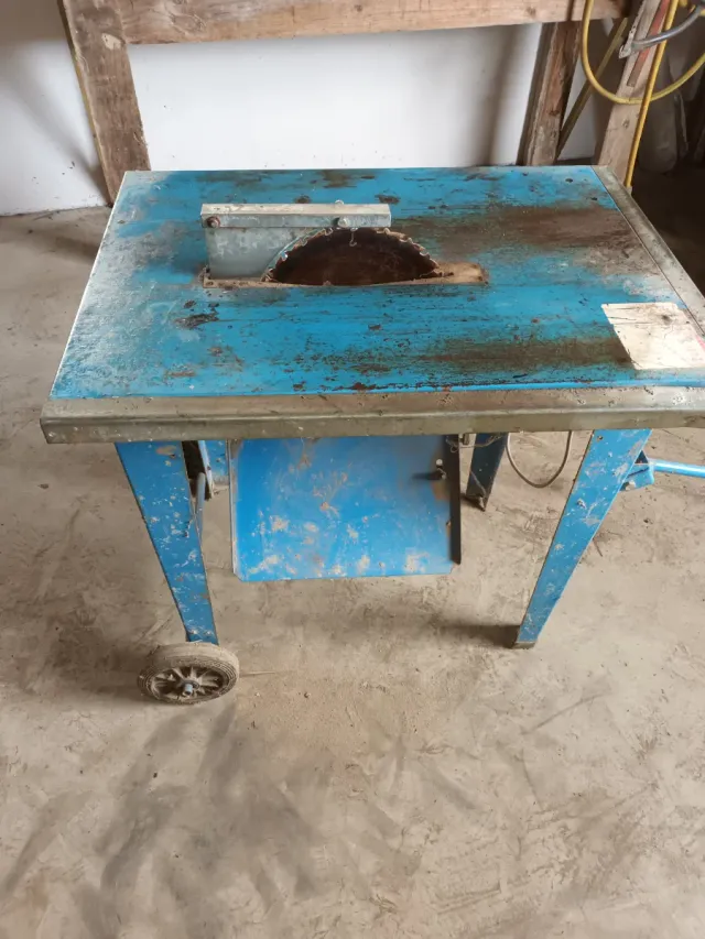 Detalles del productoSierra de mesa circular con estructura metálica y superficie de trabajo azul.