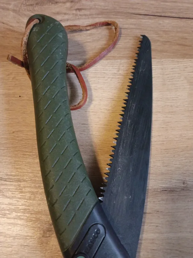 Sierra de podar plegable con mango ergonómico y correa de sujeción. - Hoja dentada de acero. - Mango de plástico verde texturizado. - Correa de cuero.