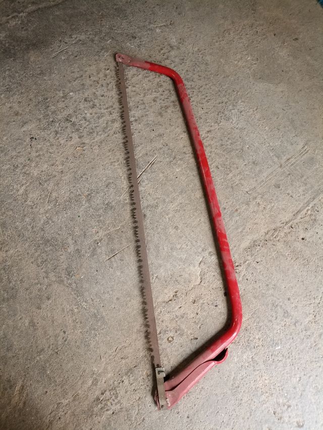 Sierra de mano con mango rojo, ideal para trabajos de jardinería o carpintería. - Hoja de sierra dentada. - Estructura de metal con pintura roja.