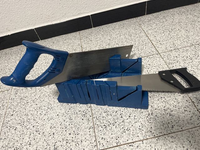 Juego de sierra Dexter con tres piezas. - Sierra de mano con mango azul. - Sierra de mano con mango negro. - Caja de inglete azul.