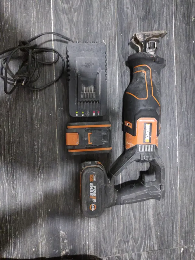 Sierra recíproca WORKPRO con cargador y dos baterías. - Sierra recíproca WORKPRO. - Cargador de batería. - Batería 20V 2.0Ah. - Batería 20V 4.0Ah.