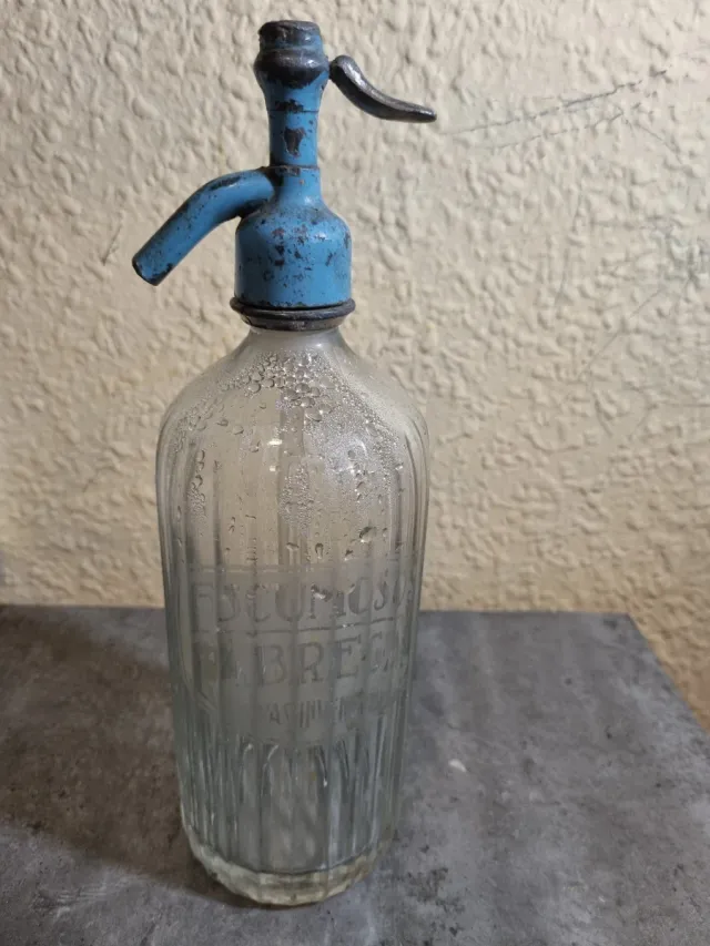 Detalles del productoSifón de vidrio con detalles serigrafiados y un tapón de hierro.