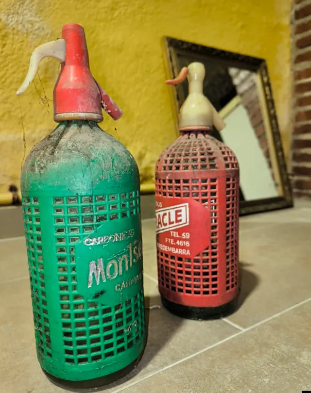 Dos sifones de soda vintage, uno verde y otro rojo, de los años 70-80. Perfectos para coleccionistas o decoración.