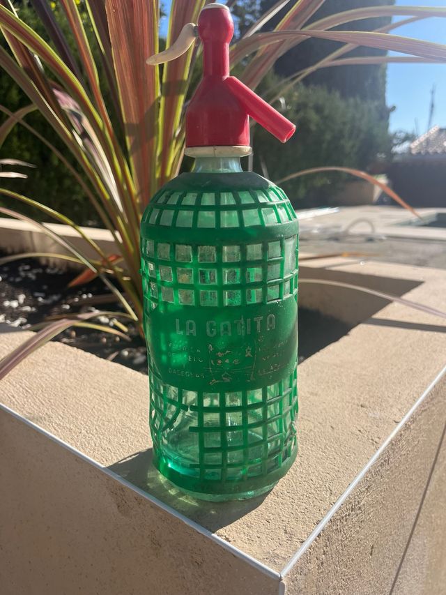 Detalles del productoSifón de vidrio verde con funda protectora de rejilla. Presenta el nombre LA GATITA grabado.