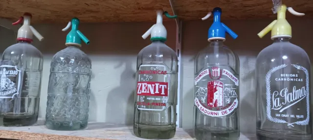 Detalles del productoColección de sifones antiguos de vidrio, perfectos para coleccionistas o decoración.