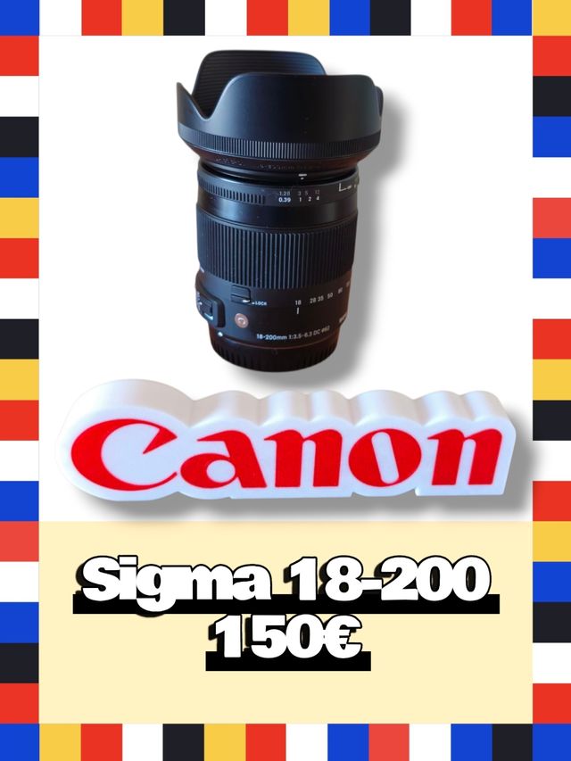 Detalles del productoObjetivo sigma 18-200,se encuentra en perfecto estado,para montura Canon.Este objetivo todoterreno incorpora la función OS (Estabilizador Óptico).Es ideal para condiciones de poca luz como en interiores y al atardecer,para viajes es el compañero ideal.El cristal SLD (Especial baja dispersión) y asférico proporcionan una excelente corrección para todo tipo de aberraciones.tiene una distancia mínima de enfoque de 45cm en toda el zoom y una ampliación máxima de 1:3.9.El sistema de enfoque interno proporciona un alto rendimiento y comodidad,con un excelente rendimiento óptico,se entrega con sus tapas y parasol,se puede enviar x 15€