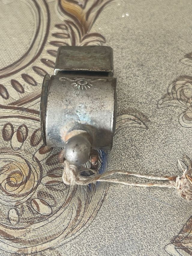 Detalles del productoEste es un silbato antiguo, hecho de metal. Presenta un diseño clásico y un cordón para sujetarlo.