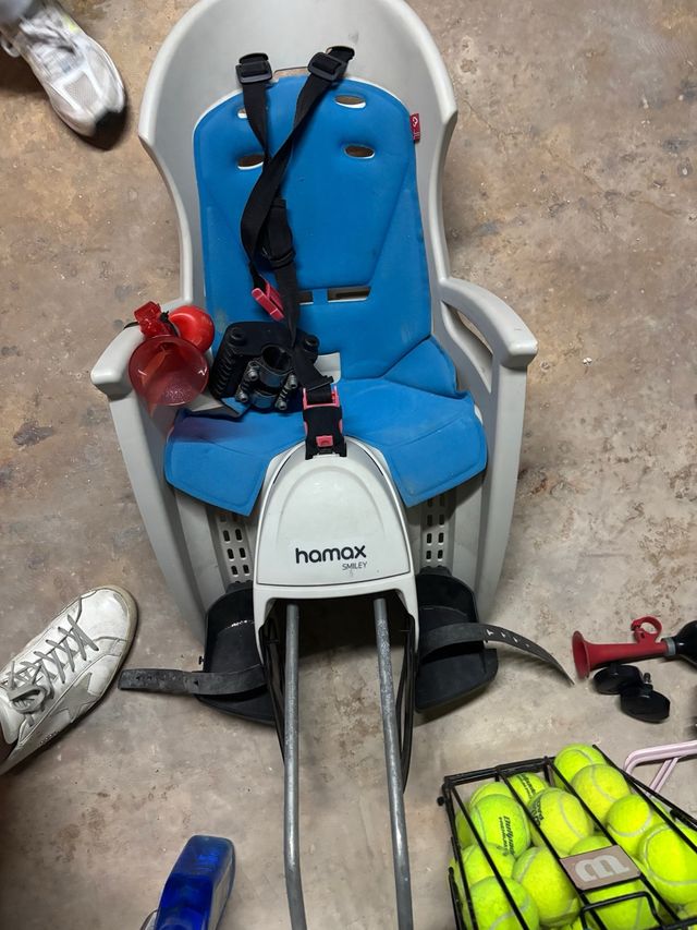 Silla de bebé Hamax Smiley para bicicleta. - Color azul y gris. - Arnés de seguridad. - Reposapiés ajustables.