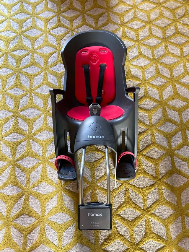 Detalles del productoSilla de seguridad para bicicleta marca Hamax, con diseño ergonómico y arnés de sujeción.