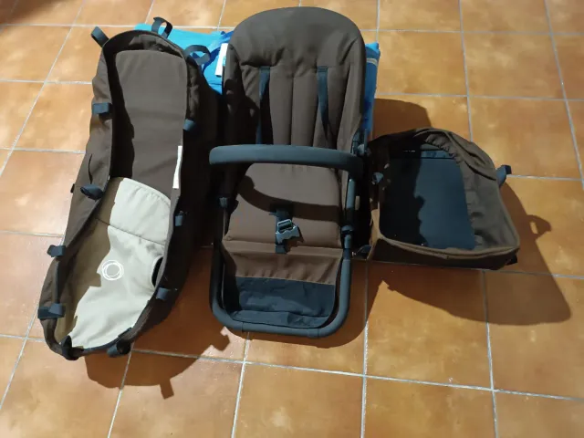 Piezas de silla Bugaboo en color marrón. - Capazo con interior beige. - Asiento con arnés de seguridad. - Capota. - Estructura metálica.