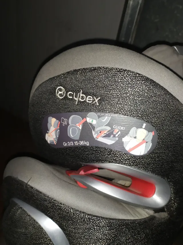 Silla de coche Cybex con sistema Isofix, apta para grupos 2/3. - Diseño en color gris y negro. - Indicaciones de uso y peso en la etiqueta.