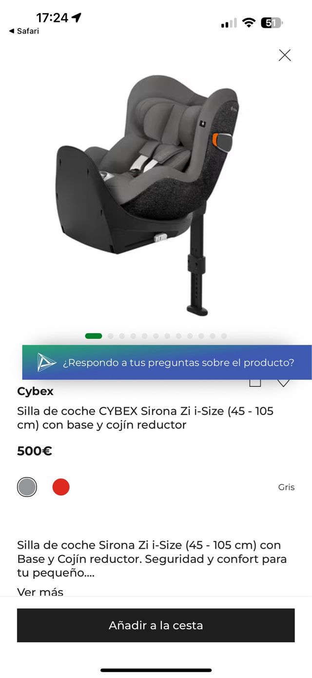 Detalles del productoVendo silla de coche Cybex Sirona Zi i-Size (45 - 105 cm) en color gris. Incluye base y cojín reductor. Está en buen estado.