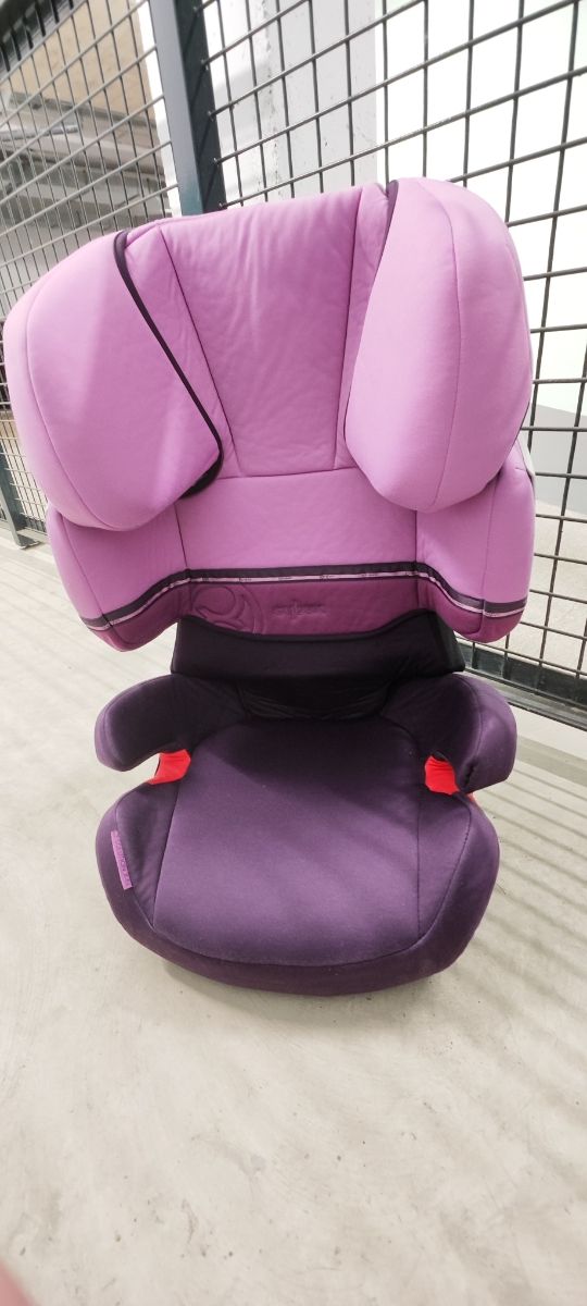 Detalles del productoVendo silla de coche Cybex Solution X-fix en color morado y rosa. Está en buen estado. Instrucciones español. Con los anclajes para el Isofix. Tapicería desmontable para el lavado. Todo limpio. Para cuando crezca el niño se puede usar sólo el altillo