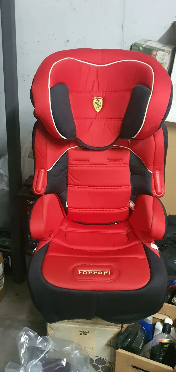 Detalles del productoSilla de coche con diseño deportivo en color rojo y negro, inspirada en Ferrari.
