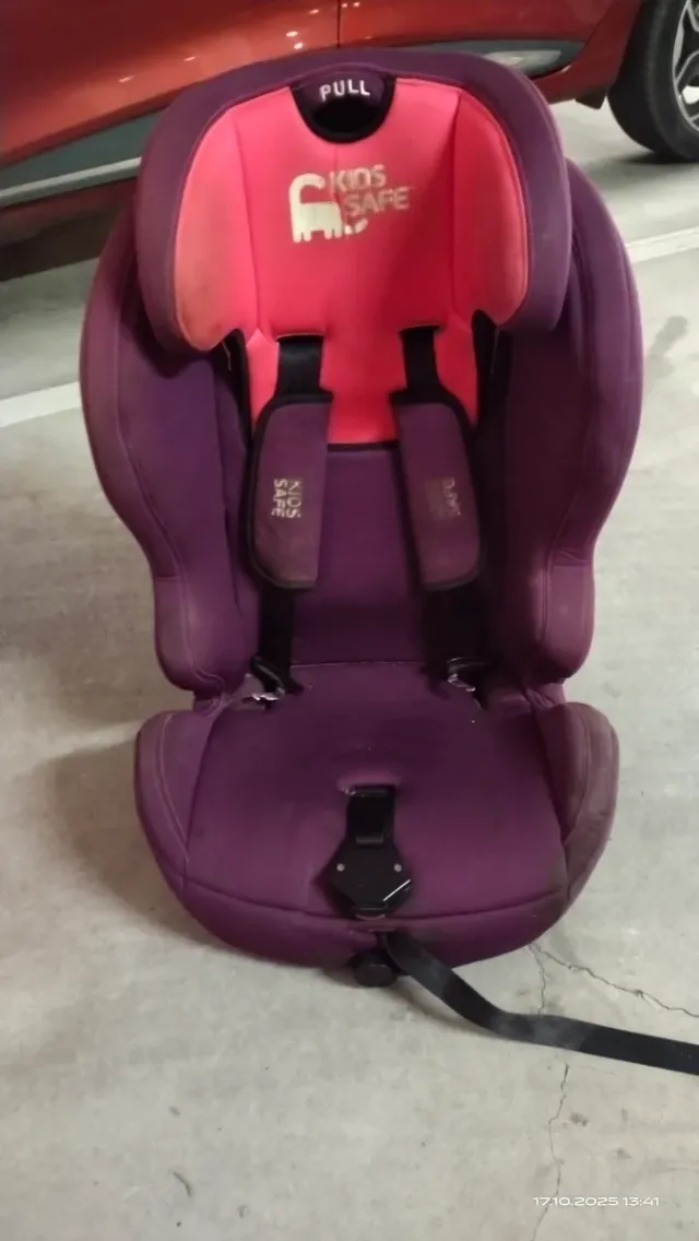 Detalles del productoSilla de coche para niños, adecuada para los grupos 1 y 2. Es de color morado con detalles en rosa.