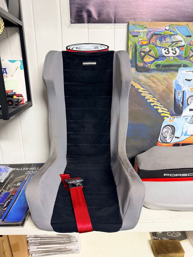 Detalles del productoSilla de coche para bebé con diseño deportivo y cinturón de seguridad rojo.