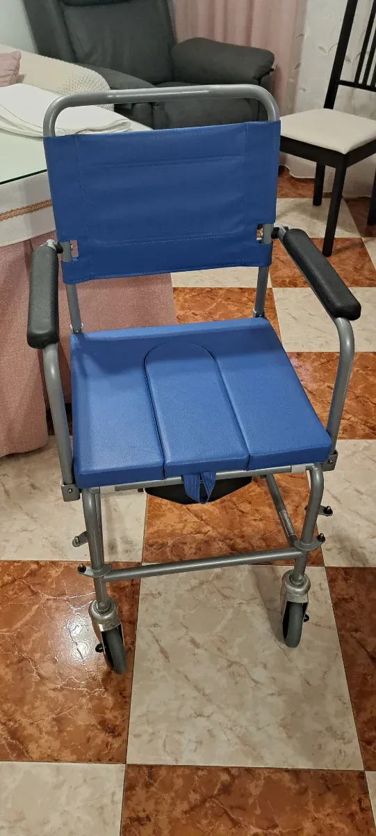 Detalles del productoSilla de baño multifunción SIN ESTRENAR para el aseo e higiene personal de personas mayores o con movilidad reducida. Asiento acolchado con tapa y cajón. Cuenta con reposabrazos y reposapiés extraibles (no aparecen en las fotos) y sistema de bloqueo en las ruedas para máxima seguridad.