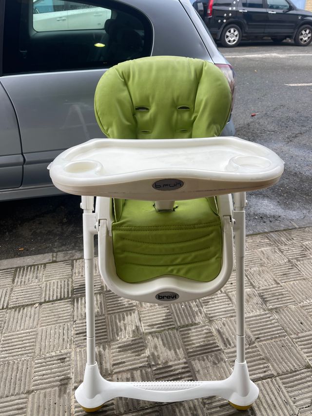 Silla de bebé Brevi B-Fun en color verde. La bandeja es blanca y extraíble. - Asiento acolchado. - Bandeja con portavasos. - Estructura plegable.