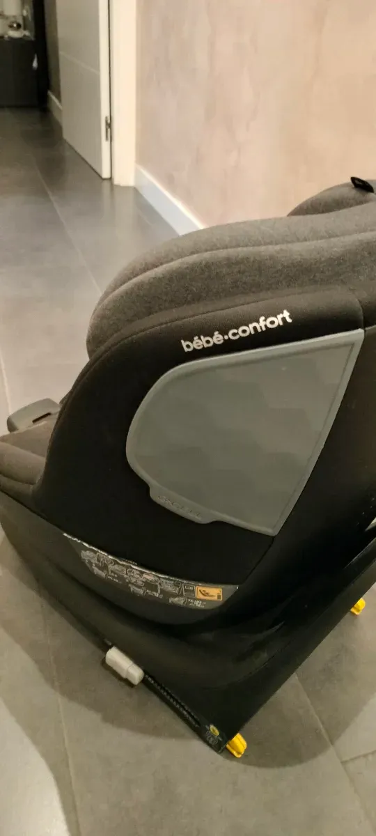 Silla de coche de la marca Bébé Confort, en color gris oscuro. - Diseño moderno y acolchado. - Incluye detalles en gris claro. - Base negra.
