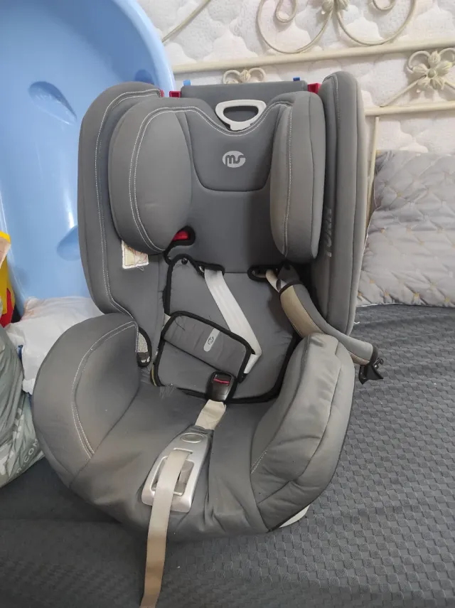 Silla de coche de color gris, con detalles en blanco y beige. - Diseño acolchado para mayor comodidad. - Sistema de arnés de seguridad. - Reposacabezas ajustable.