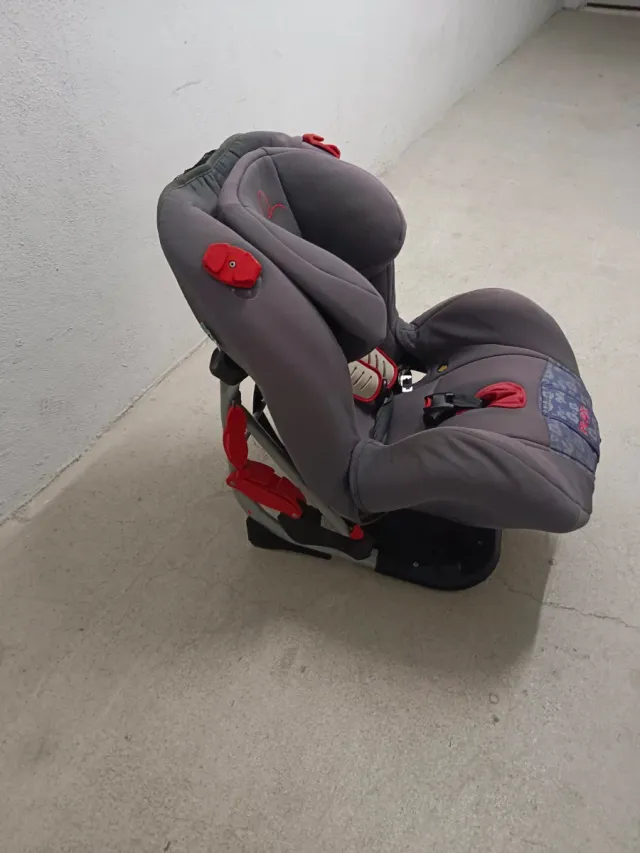 Silla de coche en color gris con detalles en rojo. Diseñada para la seguridad y comodidad. - Funda acolchada. - Sistema de arnés. - Base robusta. Hasta 24 años