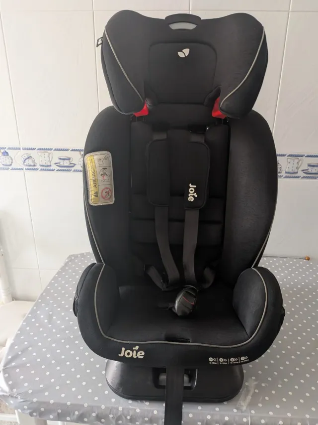 Detalles del productoSilla de coche marca Joie en color negro. Cuenta con un diseño acolchado y arneses de seguridad.