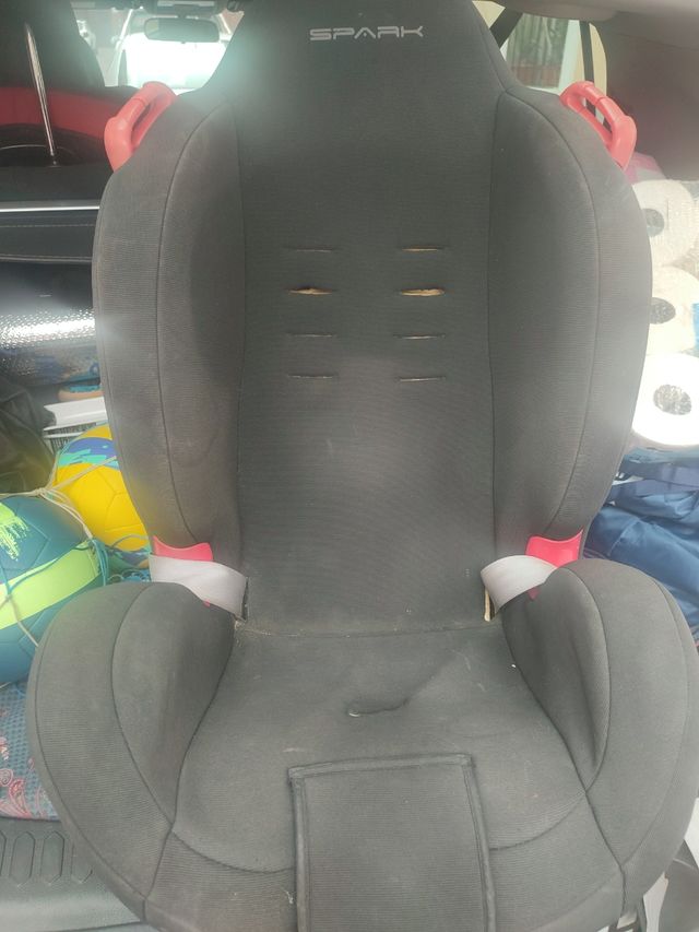 Detalles del productoSilla de coche para niños de la marca Spark. Es de color negro y cuenta con detalles en rojo.