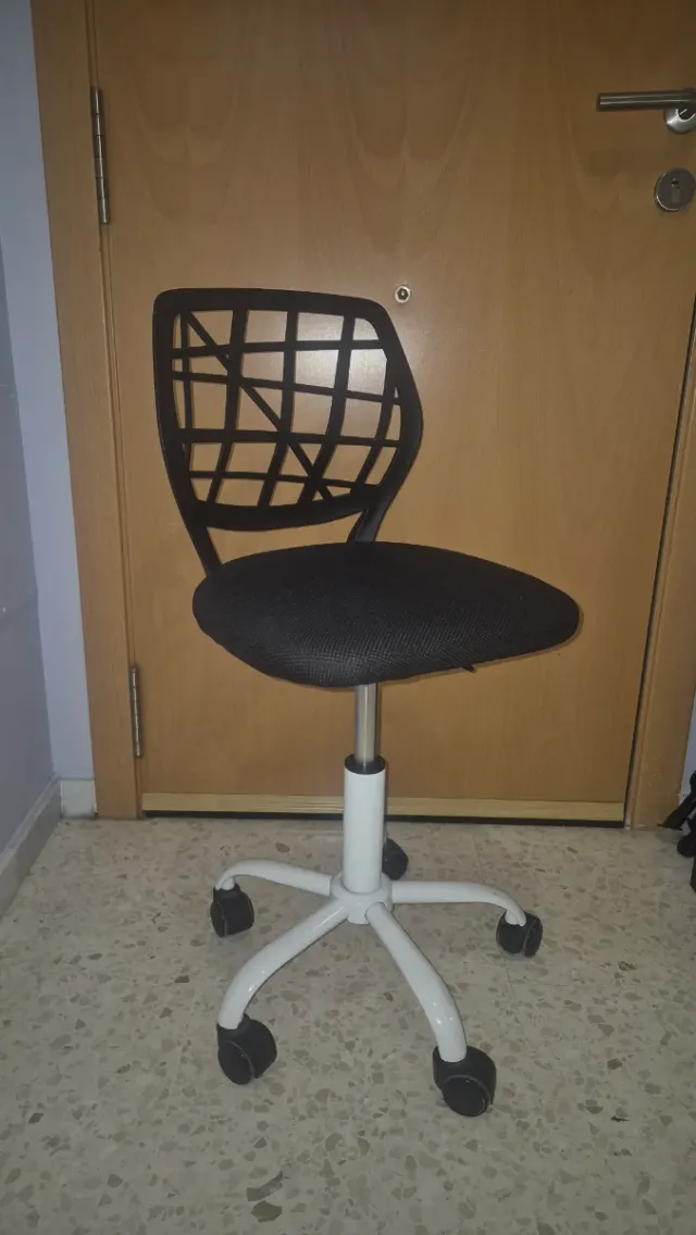 Silla de escritorio con diseño moderno y base giratoria. - Respaldo con patrón de rejilla. - Asiento acolchado. - Base con ruedas para fácil movilidad.