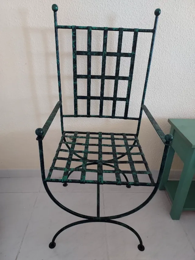 Detalles del productoElegante silla de forja con un acabado en verde desgastado que le da un toque vintage. Su diseño de rejilla tanto en el asiento como en el respaldo la hace destacar.