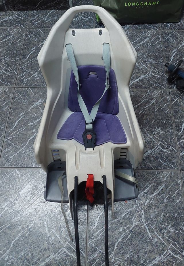 Silla de paseo de bicicleta con anclaje a la tija del sillin,un reposa pie le falta un clip pero se sujeta ver fotos