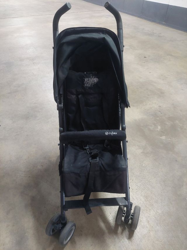 Silla de paseo negra usada pero en buen estado, con plásticos para lluvia y colchoneta de verano. Aguanta peso hasta 20 kg.