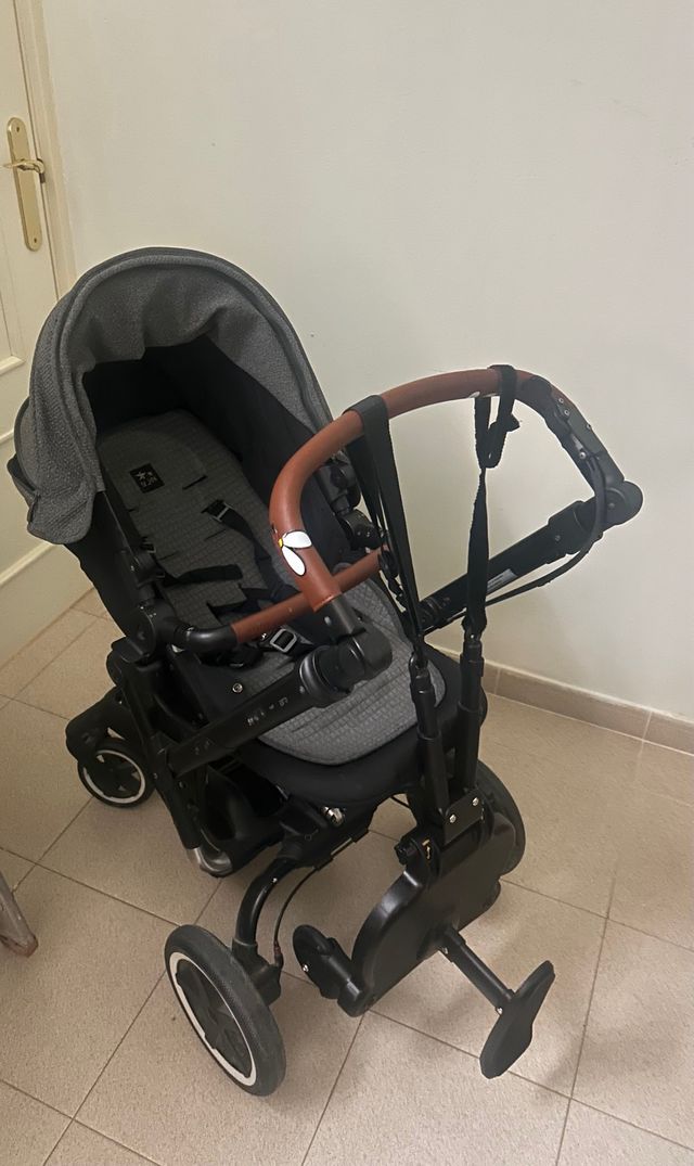 Detalles del productoSilla de paseo Jane Rider con asiento reversible (posición mirando hacia delante o hacia atrás) en color negro y gris, con manillar de piel regulable en color marrón. Tiene un pequeño desconchon en la piel por poner la sombrilla de paseo pero esta tapado. Tiene ruedas todoterreno con amortiguación regulable.