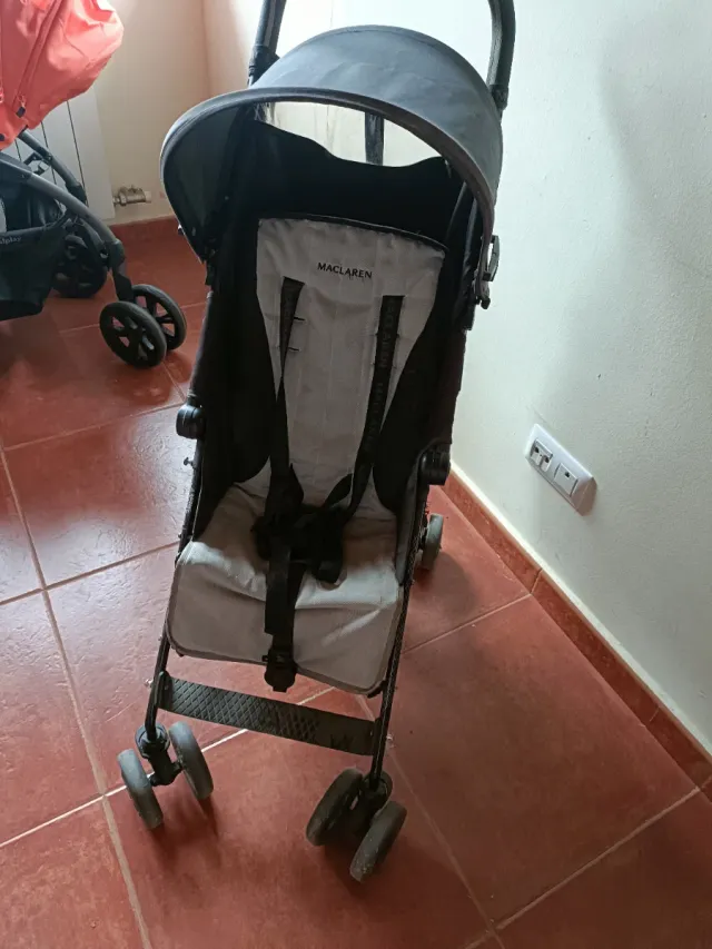 Silla de paseo Maclaren en color gris y negro. Es ligera y fácil de plegar. - Capota. - Arnés de seguridad. - Ruedas delanteras giratorias.