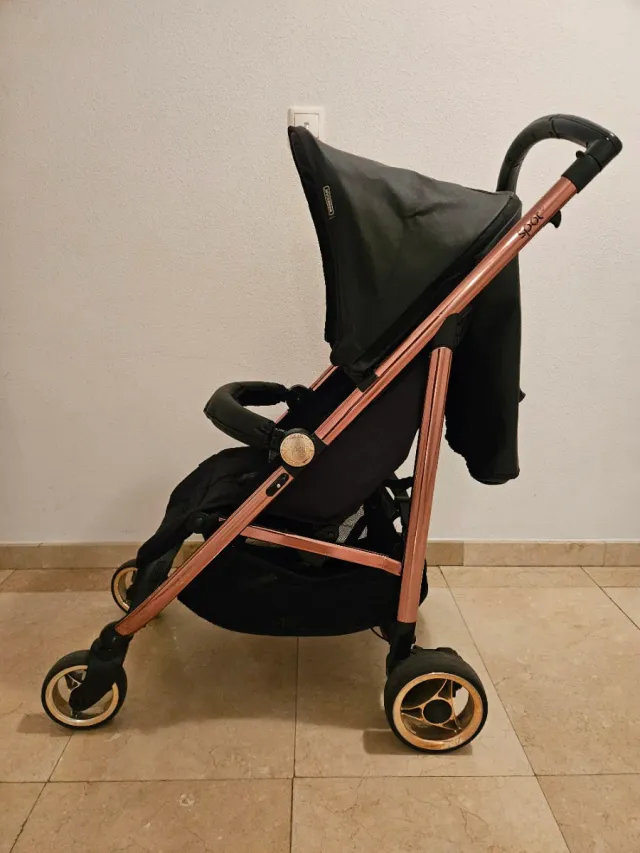Detalles del productoSilla de paseo ligera y manejable, con un diseño moderno en color negro y detalles en color cobre.