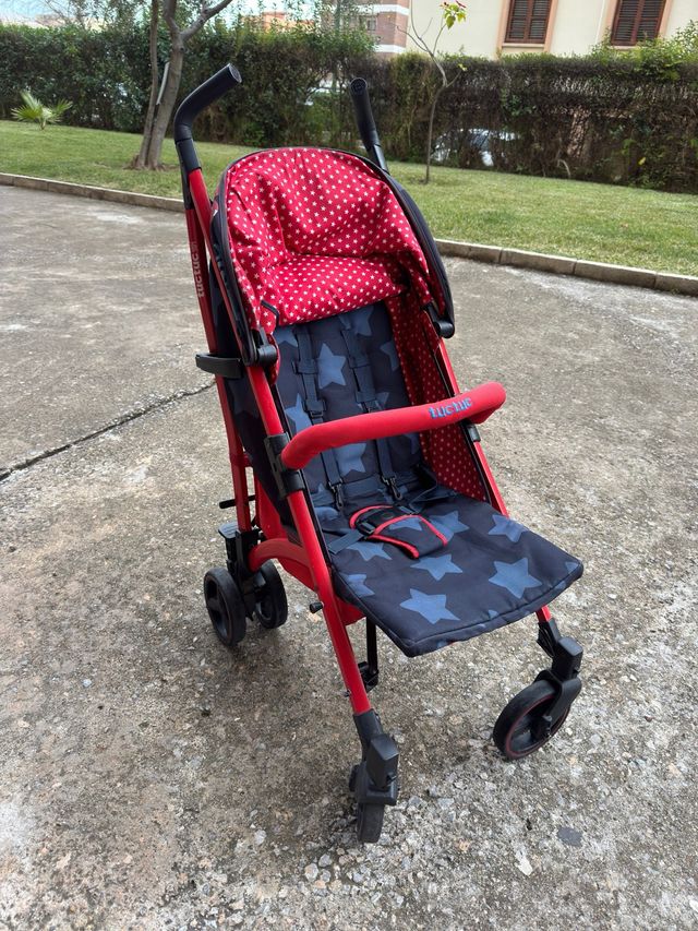 Tiene respaldo abatible (queda completamente tumbado) y la capota se cierra casi en su totalidad, con una claraboya para poder ver al niño así como una bolsa para guardar alguna cosa debajo (está deteriorada)