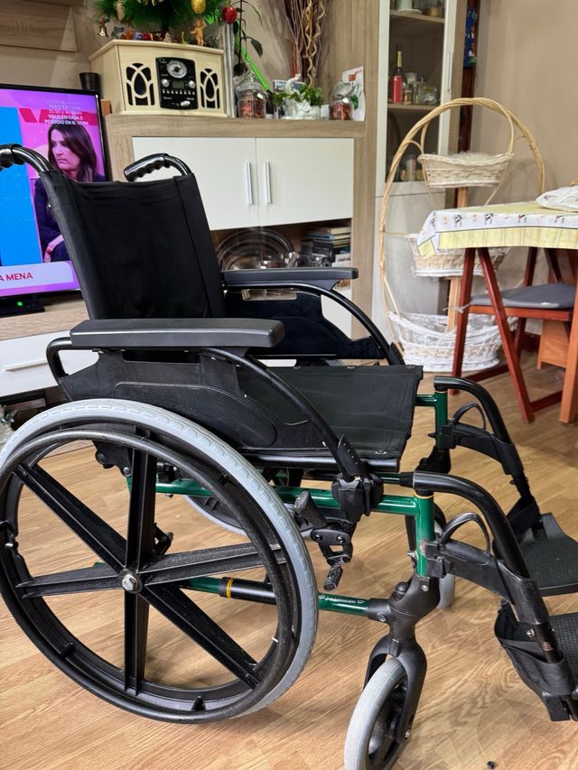 Silla de ruedas Breezy en color verde y negro. - Asiento y respaldo acolchados. - Ruedas grandes traseras y pequeñas delanteras. - Reposapiés ajustables.
