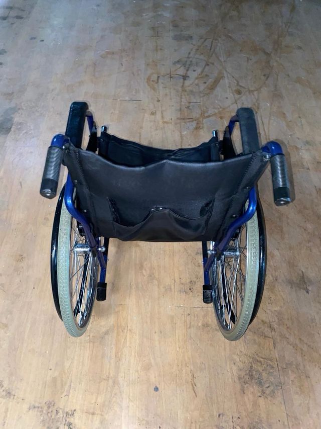 silla de ruedas plegable (se dobla perfectamente). negro y azul. marca Brezzy. ligera y de facil manejo. - sin reposapies -