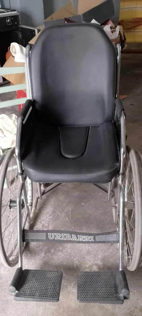 Silla de ruedas con respaldo muy acolchado al igual que el asiento, con apertura para inodoro/wc