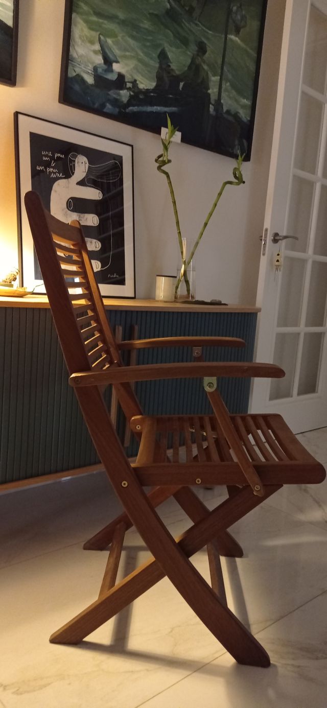 Detalles del productoPreciosa silla de madera de teca con reposabrazos y plegable, válida tanto para interior como para exterior. Las medidas se aprecian en las imágenes (97cm de alto -respaldo-X 59cm de ancho -reposabrazos-).