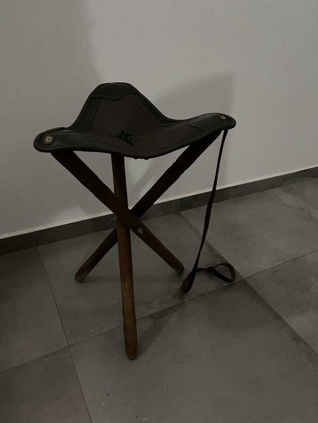 Detalles del productoSilla de trípode con asiento de cuero y patas de madera. Es un asiento portátil y ligero.