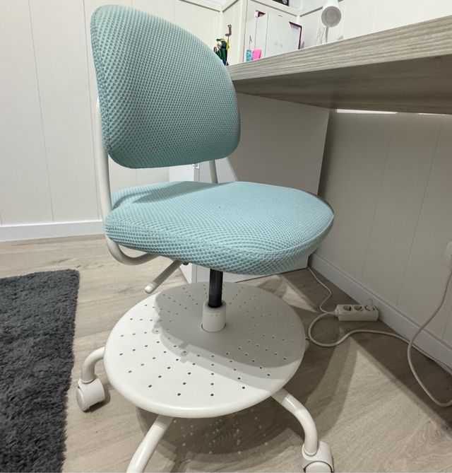 Detalles del productoSilla de escritorio para niños, de Ikea, modelo Vimund. Con respaldo flexible, regulable en altura y fondo, con apoya pies, y funda lavable. En perfecto estado porque se ha usado muy poco.