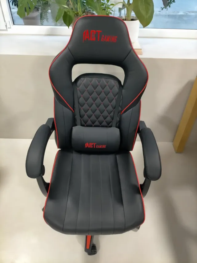 Detalles del productoSilla de estilo gaming con un diseño moderno y deportivo de cuero sintético negro y detalles en rojo.