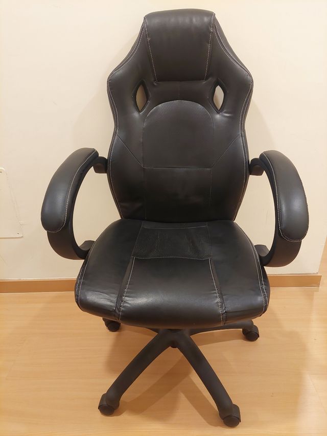 Silla de estilo gaming en color negro. Tapicería de cuero sintético y base con ruedas. Usada como silla de despacho. No es marca Techni Sport.