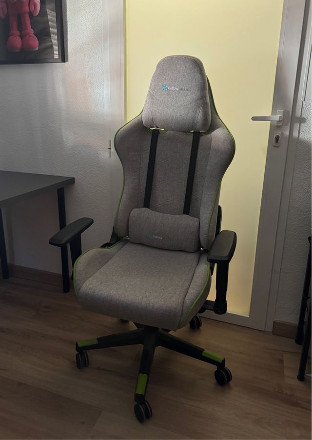 Silla de gaming en color gris con detalles en verde. - Diseño ergonómico. - Reposacabezas y cojín lumbar incluidos. - Base con ruedas para fácil movilidad.